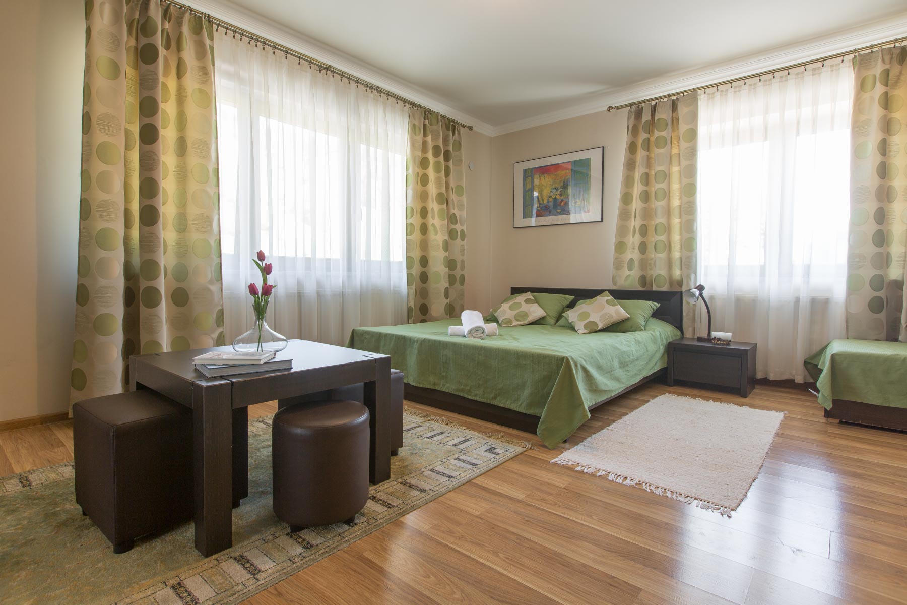 Pokoje 2,3,4,5 osobowe oraz studia z łazienkami i tv. Dostępny jest duży parking dla autobusów. Zapraszamy do oglądnięcia ujęć lotniczych naszego obiektu oraz dzielnicy Harenda.